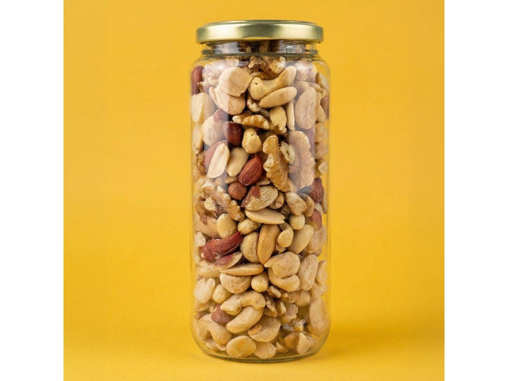 Zloženie: ARAŠIDY lúpané pražené, MANDLE lúpané pražené, KEŠU ORECHY pražené, VLAŠSKÉ ORECHY, MAKADAMOVÉ ORECHY pražené. (Všetko pražené nasucho, bez pridaného oleja a soli).
